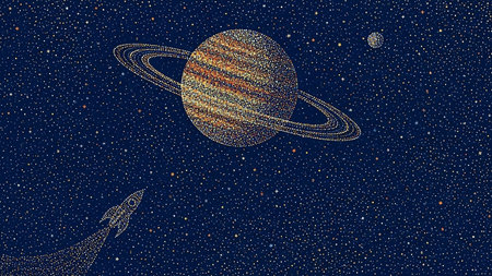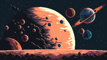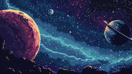 Mesmerizing pixel art of space with a large textured planet and a distant ringed planet, set against a starry nebula, evoking nostalgia and cosmic awe