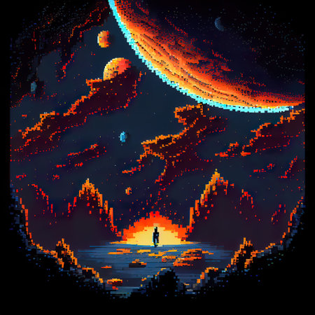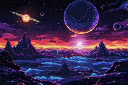 A pixelated depiction of a colorful alien sunset scene with a ringed star, planets, and mountains silhouetted against the night sky.