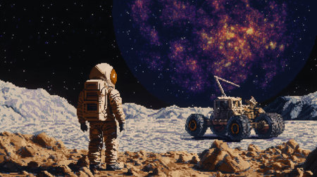 Pixel art screenshot with astronaut character front view, next to a space rover on the moon with a vibrant galaxy sky, 8-bit Nintendo aesthetic