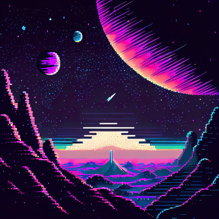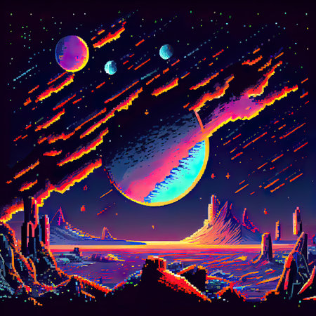 Generative ai galaxy landscape with planets and stars. 8Bit pixel art background. Retro-inspired virtual alien world pixelated game scene. Planet surface with far Universe starscape 2d gaming level