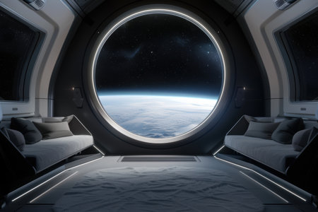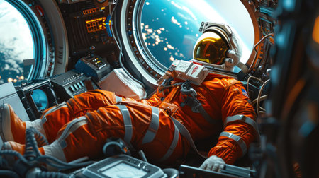 American astronaut in a spacesuit standing inside a spacecraft, gazing at the breathtaking view of earth through a large porthole, capturing the beauty of space exploration