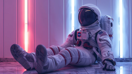 An astronaut in a spacesuit Sits in a room with neon lighting.