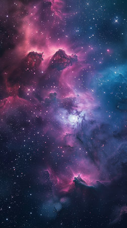 Witness a breathtaking nebula formation in this stunning illustration of deep space. A colorful and vibrant tapestry of purple, blue, and pink hues illuminate the night sky, showcasing the cosmos and its celestial wonders. This artwork depicts a galaxy filled with countless stars and cosmic dust, offering an ethereal and mysterious background. Ideal for wallpaper, artistic projects, and science education materials, this cosmic display embodies the beauty of the universe. Explore the depths of outer space and its nebula formations.