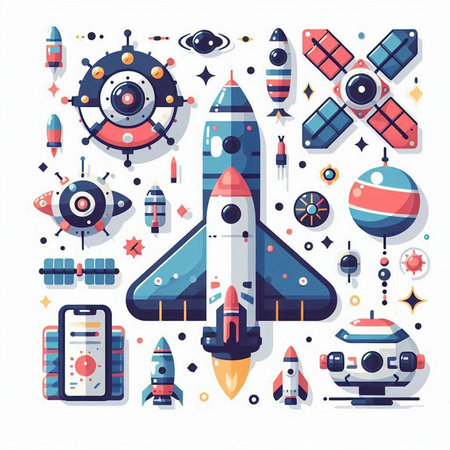 Space exploration flat vector illustration. Spaceship, rocket, spaceship, alien, spaceship, solar system, satellite, ship, rocket, astronaut helmet and other objects.