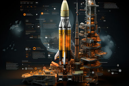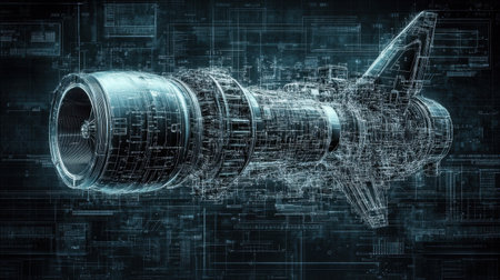 This high-resolution illustration features a detailed rocket engine, showcasing intricate digital blueprints and circuit patterns, ideal for technical projects.