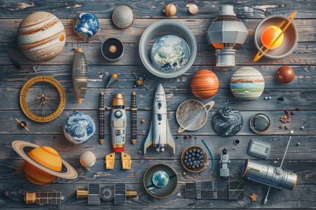 Astronomy Day Celebration with Telescopes, Planets, and Celestial Phenomena on Wooden Background AI