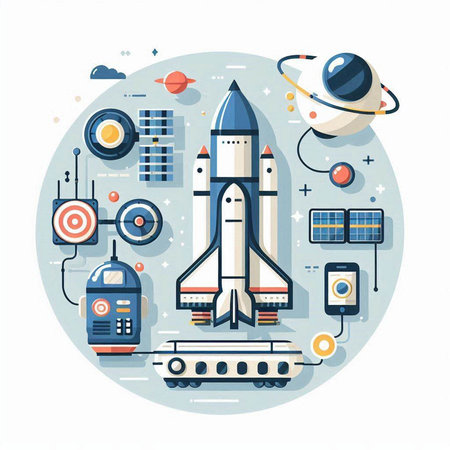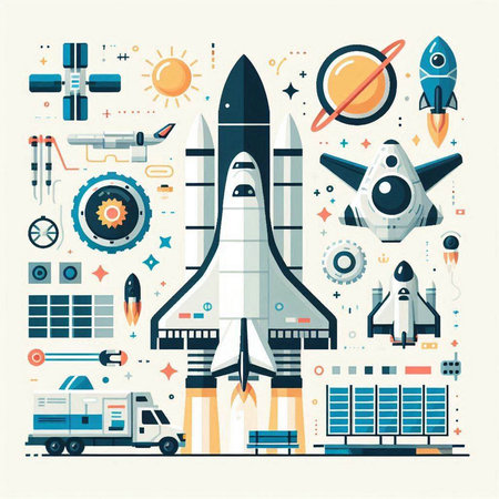Space technology flat design concept with rocket, spaceship, planets, stars and other elements isolated vector illustration