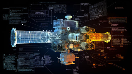 A 3D holographic satellite image shows a sleek, cylindrical body with large solar panels extending from its sides and various antennas for communication and data transmission.