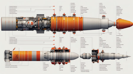 This image showcases a futuristic rocket engine design with intricate details and technical specifications set against a dark background. Ideal for technology enthusiasts.