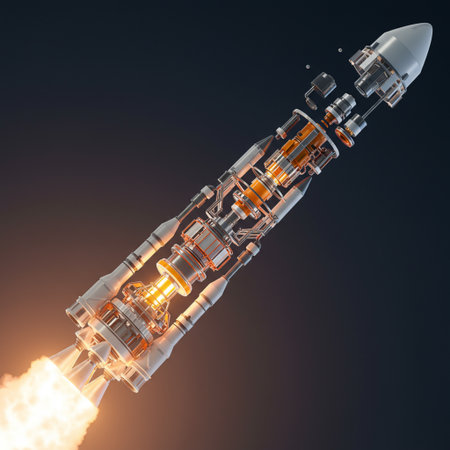 Detailed photorealistic exploded-view diagram of a rocket launch sequence. Showcasing internal components and propulsion systems with clean lines and technical precision on a modern background. No shadows, high detail, 8k resolution.