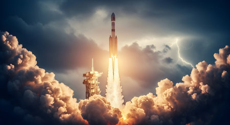 Embark on a journey of innovation and ambition with this captivating image. A rocket launch symbolizes the spirit of startups and the dynamic nature of the business world. This concept captures the excitement and determination that drive entrepreneurs and their quest for success. The fiery propulsion of the rocket represents the power of ideas and the drive to reach new heights. Perfect for projects related to startups, entrepreneurship, business concepts, technology, innovation, and the pursuit of ambitious goals