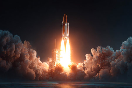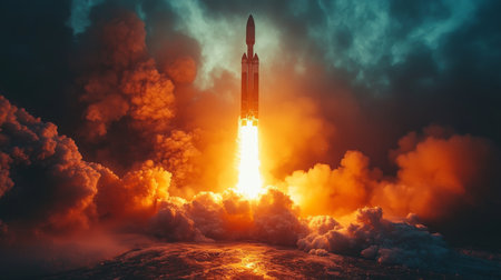 A rocket ignites during a night launch, unleashing massive flames and smoke. The scene captures the energy and excitement of space exploration and technology.