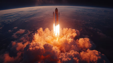 Reusable space rocket launching from spaceport leaving planet earth at sunset with orange fire and smoke illuminating the scene, symbolizing space exploration and new frontiers