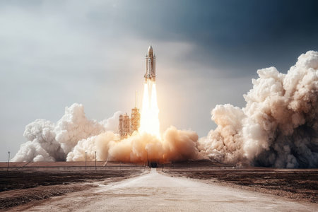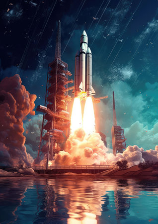 Embark on a journey of innovation and ambition with this captivating image. A rocket launch symbolizes the spirit of startups and the dynamic nature of the business world. This concept captures the excitement and determination that drive entrepreneurs and their quest for success. The fiery propulsion of the rocket represents the power of ideas and the drive to reach new heights. Perfect for projects related to startups, entrepreneurship, business concepts, technology, innovation, and the pursuit of ambitious goals