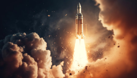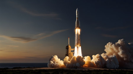A rocket ignites during a night launch, unleashing massive flames and smoke. The scene captures the energy and excitement of space exploration and technology.