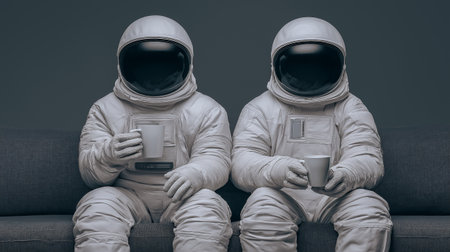 Two astronauts relax on a couch, each holding a coffee cup, blending the themes of space exploration and comfort in a unique and humorous setting