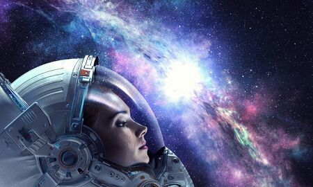 Woman space explorer against background with planet