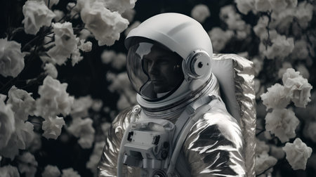 Astronaut in space suit among vibrant flowers in summer meadow. Surreal portrait of a space traveler