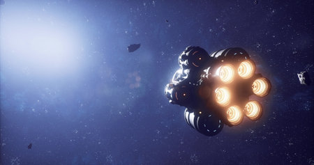 A futuristic spaceship is flying through an asteroid belt, illuminated by bright lights, amidst the vastness of deep space. The surrounding area features asteroids scattered around.