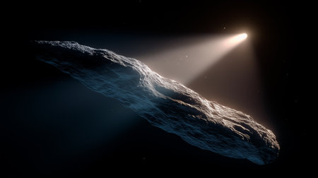 An interstellar object travels elegantly through the vast darkness, illuminated by distant stars.