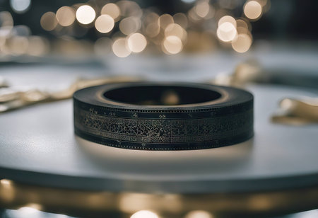 Old scratched gold reel with audio or video tape on a gray studio background. Bobbin, retro magnetic spool. Round reel for analogue projector or sound record. Videotape, filmstrip.