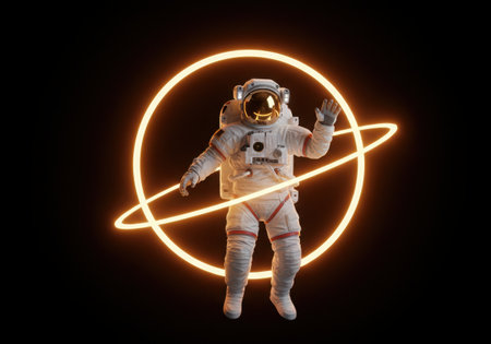 An astronaut in a white spacesuit waves his hand. Behind him are glowing orange rings orbiting around him. The background is dark, creating a stark contrast with the bright rings and the astronaut's suit.