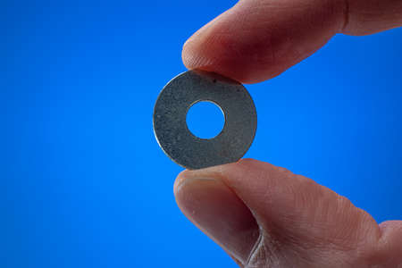 Very small metal washer held between fingers by man. Close up macro studio shot, isolated on blue background.