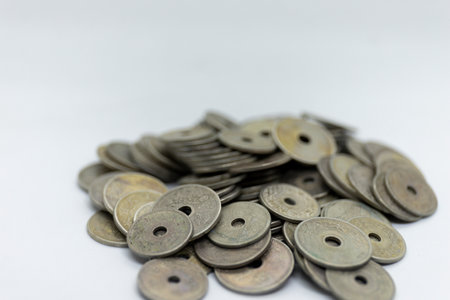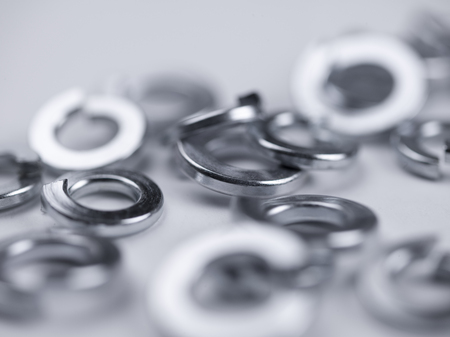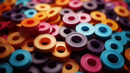 Close-up shot of an array of metallic washers scattered on a surface, showcasing their shiny, reflective surfaces and intricate details. Industrial and DIY concept.