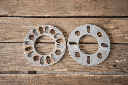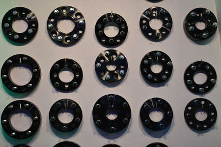 Automotive parts - close up new stainless black metal remote adapter spacer wheel hub of the car. on black background