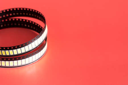 Yellow Led strip coil packaging closeup isolated on red background. Spare part for repair lamp or latern. Diode tape in the package