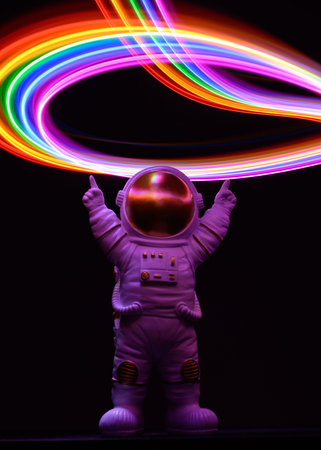 An AI generated illustration of an astronaut in space suit with arms outstretched, with a rainbow on a dark background