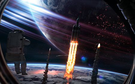 Rockets, astronaut on background of deep space planets. View from porthole. Science fiction. Elements of this image furnished by