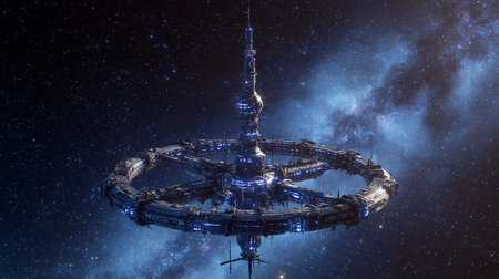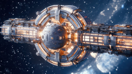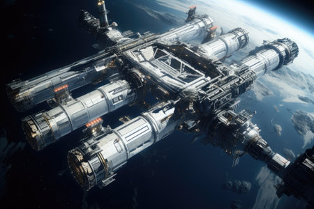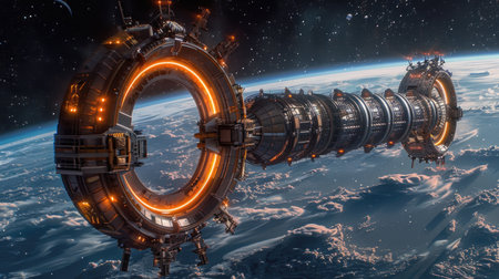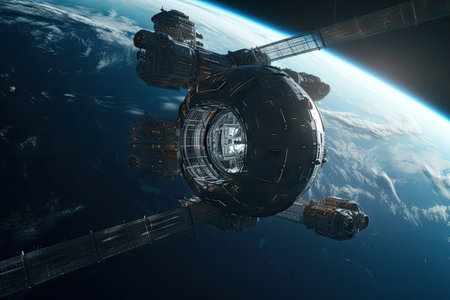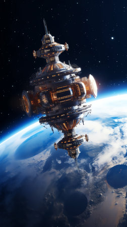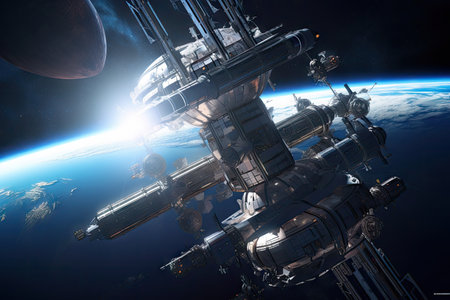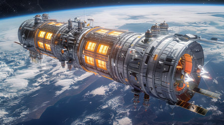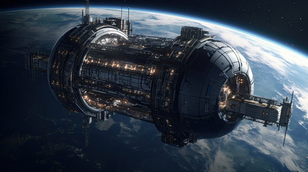 An Advanced space station orbiting planet Earth, showcasing human achievement in space architecture and exploration.
