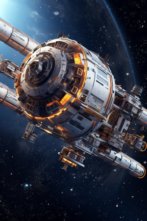 Futuristic space station orbiting Earth, featuring intricate mechanical details, glowing thrusters.