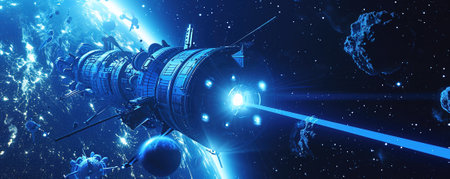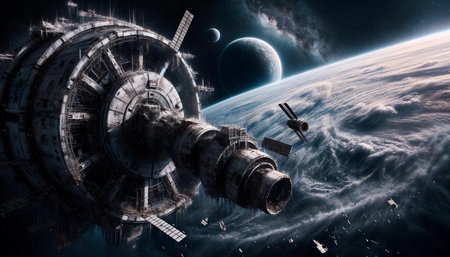 This captivating image features a space station orbiting Earth amidst swirling cosmic debris. It highlights human innovation in space exploration against the backdrop of our planet.