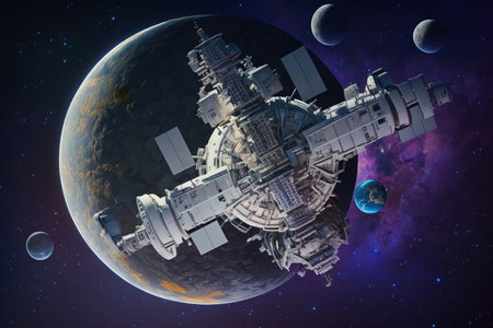 An AI generated illustration of a satellite station in orbit, surrounded by planets