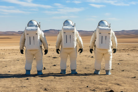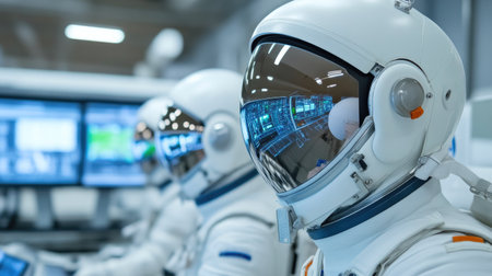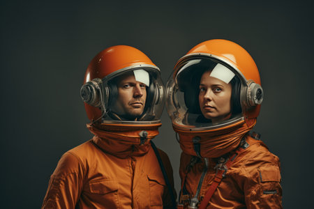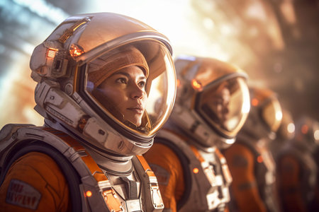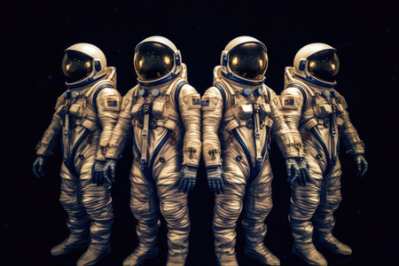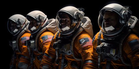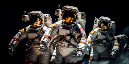 An AI generated image of astronauts in space suits and helmets on blurred background