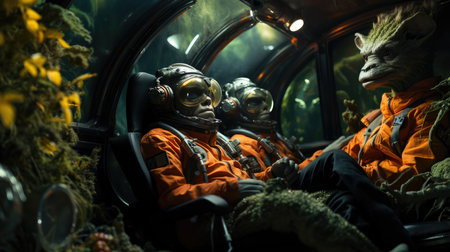 Futuristic astronaut inside lit space ship. Alien pilots flying spaceship through outer space.