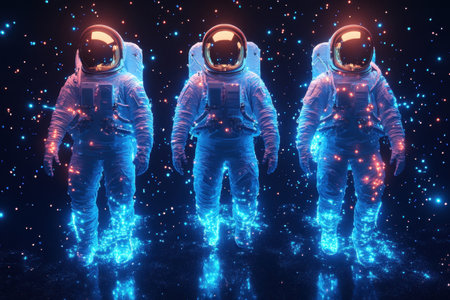 Three astronauts adorned in illuminated space suits stand on a reflective surface amidst a stunning cosmic backdrop. Stars and colorful particles swirl around them, creating an ethereal atmosphere in this imaginative space exploration scene.