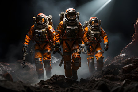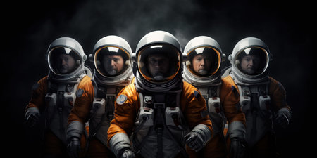 Group of astronauts in orange space suits exploring the unknown, discovering new frontiers, group photo, AI generative