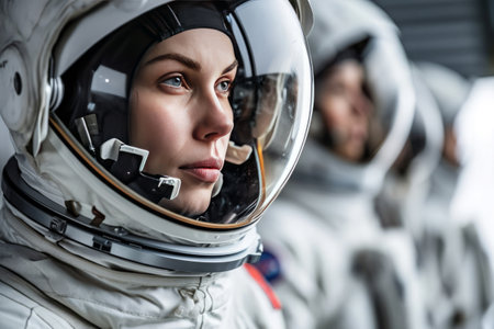 Portrait of female astronaut looking through helmet glass. Beautiful woman wearing space suit. Space travel and colonization concept