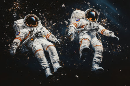 Two astronauts in space suits drift effortlessly in the vast darkness of space, surrounded by stars and particles, exploring the mysteries of the universe.