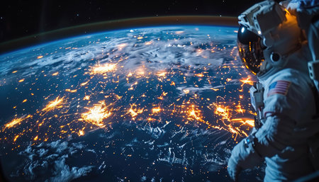 A close-up of an astronaut in a white suit and helmet, gazing at Earth with its city lights from space.