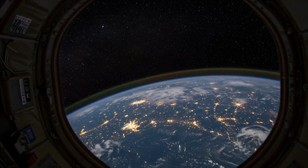 View of Earth from the space station window shows city lights against the backdrop of space Great for science and space exploration themes.