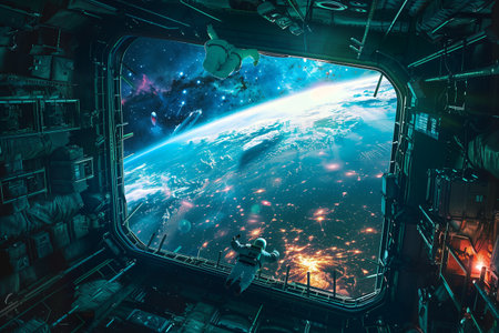 inside the space station, with view of earth below, created with generative ai