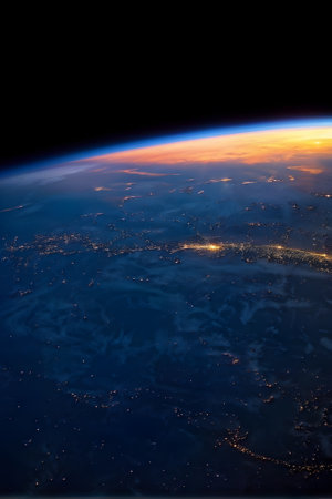 Overlooking the majestic curve of Earth from the International Space Station, this breathtaking vista captures swirling clouds and vast oceans illuminated by distant stars in the cosmos.