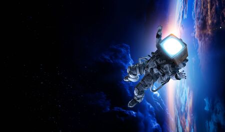 Astronaut with TV head in space. Mixed media.