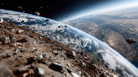 This captivating image showcases a breathtaking view of Earth from space, with asteroids and cosmic debris illustrating the vastness of the universe.