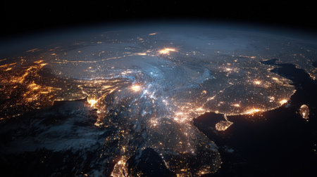 Stunning Aerial View of Asia at Night Captured from Space Highlighting Bright City Lights, Geography, and Natural Landscapes Beneath a Starry Sky