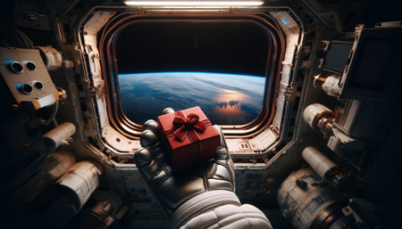 An astronaut in a space station holds a red gift box, Earth visible through the window, creating a unique moment in the cosmos. AI Generated.